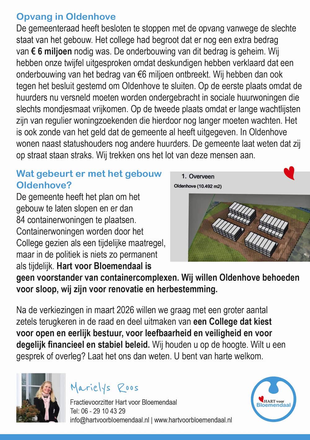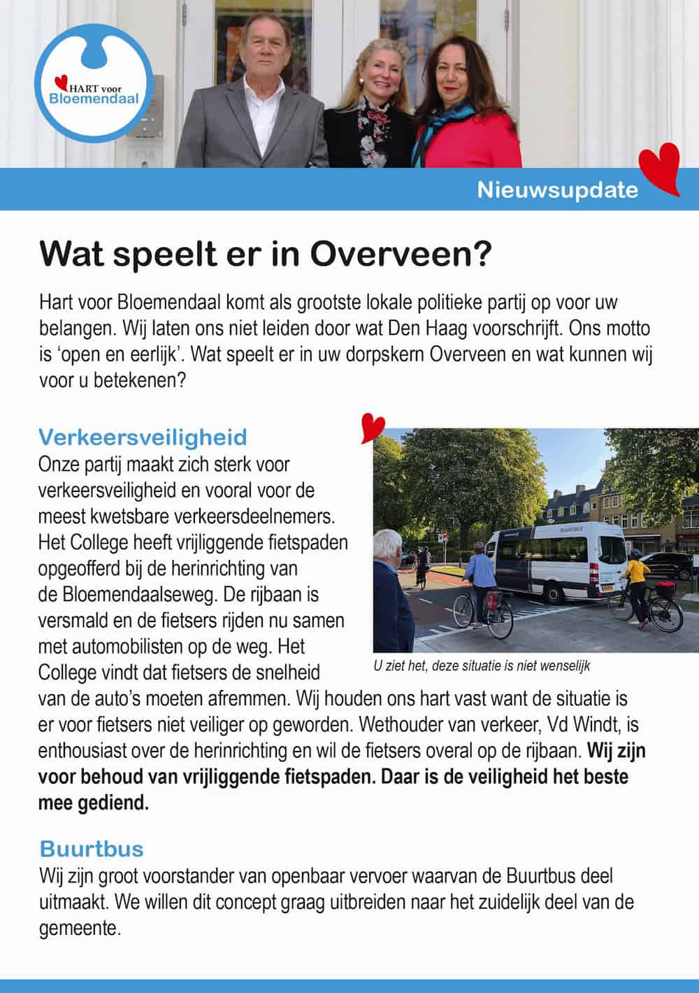 Voor onze inwoners maken wij met enige regelmaat een folder waarin wij u informeren over de politieke actualiteit in onze gemeente. Hieronder vindt u de inhoud van onze folder die zich dit keer richt op de dorpskern Overveen. Wij hebben deze folder onlangs huis-aan-huis verspreid.